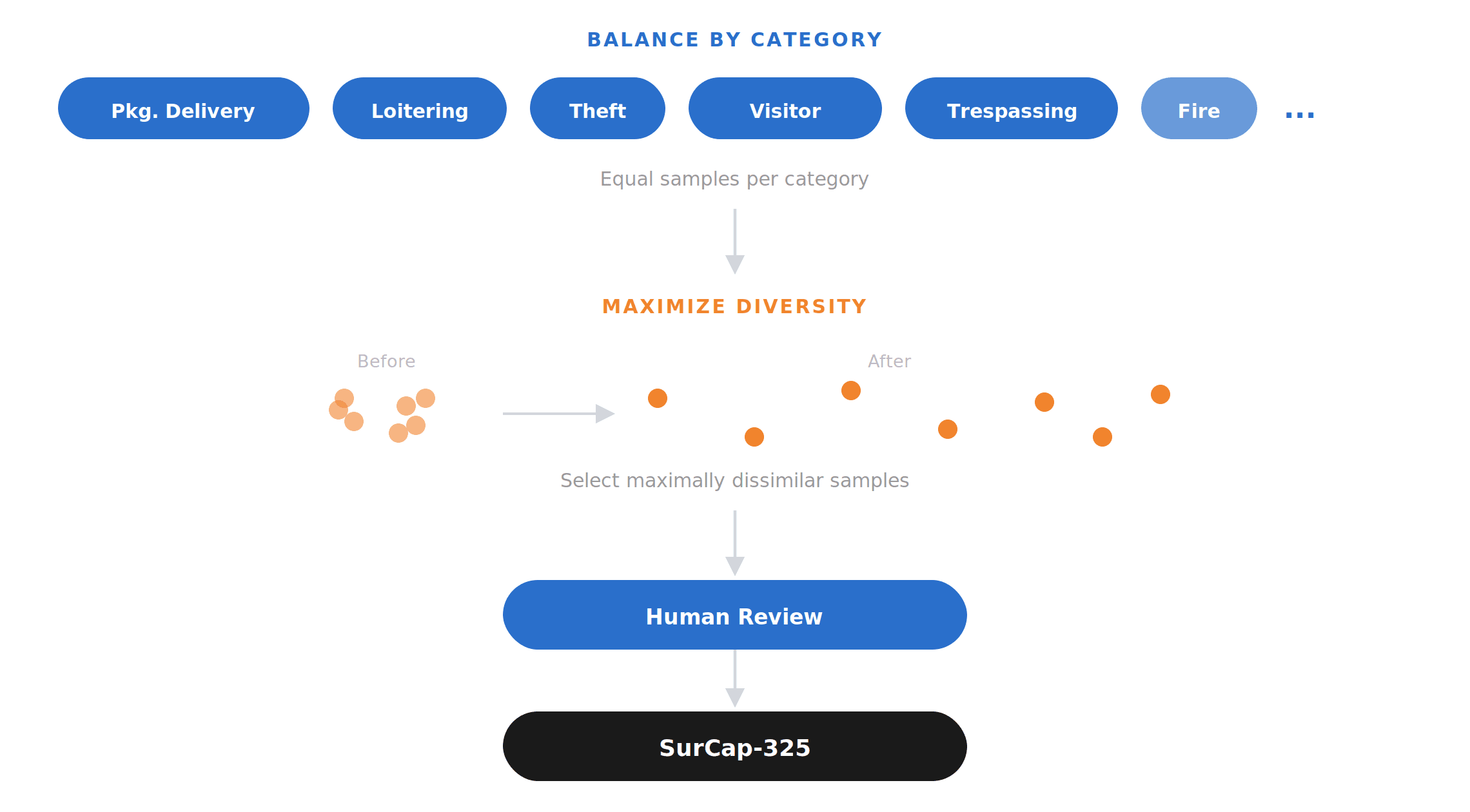 We built SurCap-325 around two principles: balance and diversity. We grouped videos by event type (theft, package delivery, loitering, visitor approach, and other home-security scenarios) and set target sample counts per category. This ensured the benchmark wasn't dominated by a few frequent classes and instead reflected a controlled distribution across the kinds of events we care about.