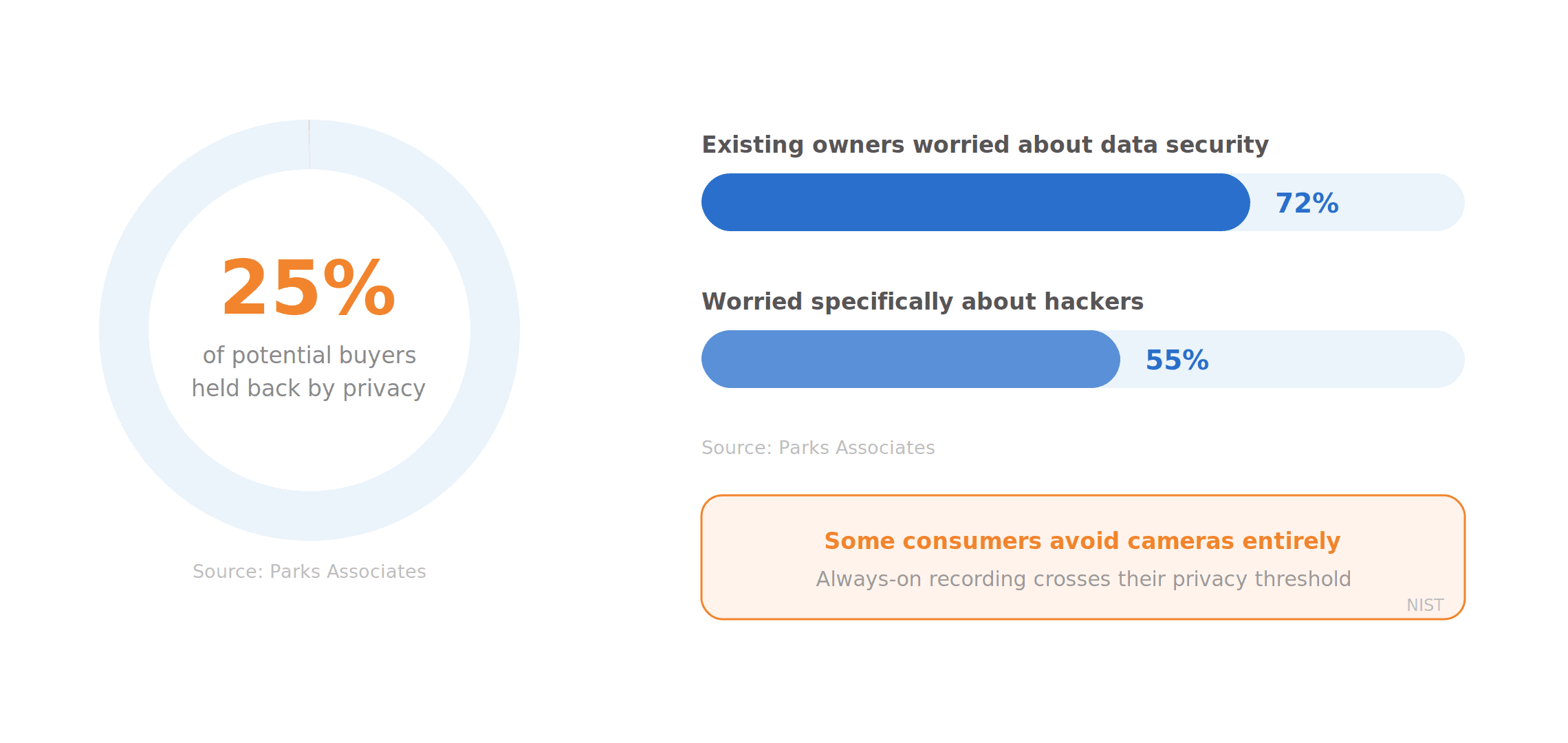 That matters because privacy remains a real barrier to adoption. Parks Associates found that 25% of potential smart home buyers are held back by data privacy concerns. Among existing owners, 72% worry about data security and 55% worry specifically about hackers. A NIST study found that some consumers deliberately avoid cameras entirely because always-on recording crosses their privacy threshold.