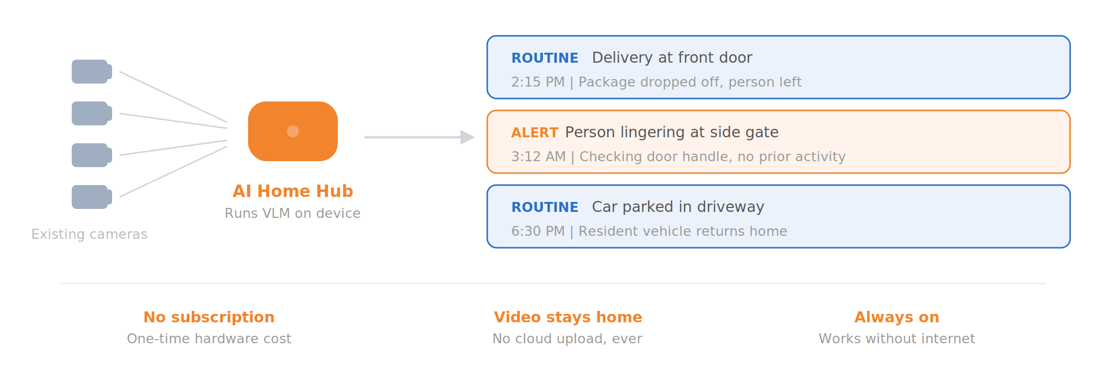 Scalable cost structure. Cloud-based VLM inference is expensive as the number of cameras scales (we break down the math later in this post). A small on-device model turns what would be a recurring per-camera API cost into a one-time hardware investment. The core intelligence runs locally at no marginal cost per camera, which fundamentally changes the economics for both consumers and providers.