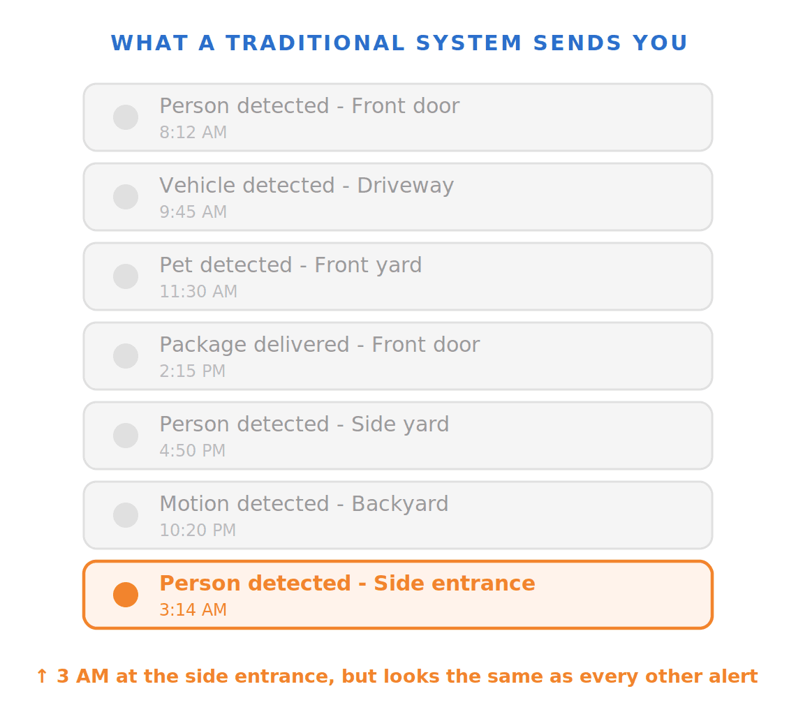 Traditional cameras can tell you "person detected," but they can't reason about context. A person on the sidewalk at noon is not interesting. The same person lingering near your back door at 2 AM is a completely different story. Current systems treat both identically.