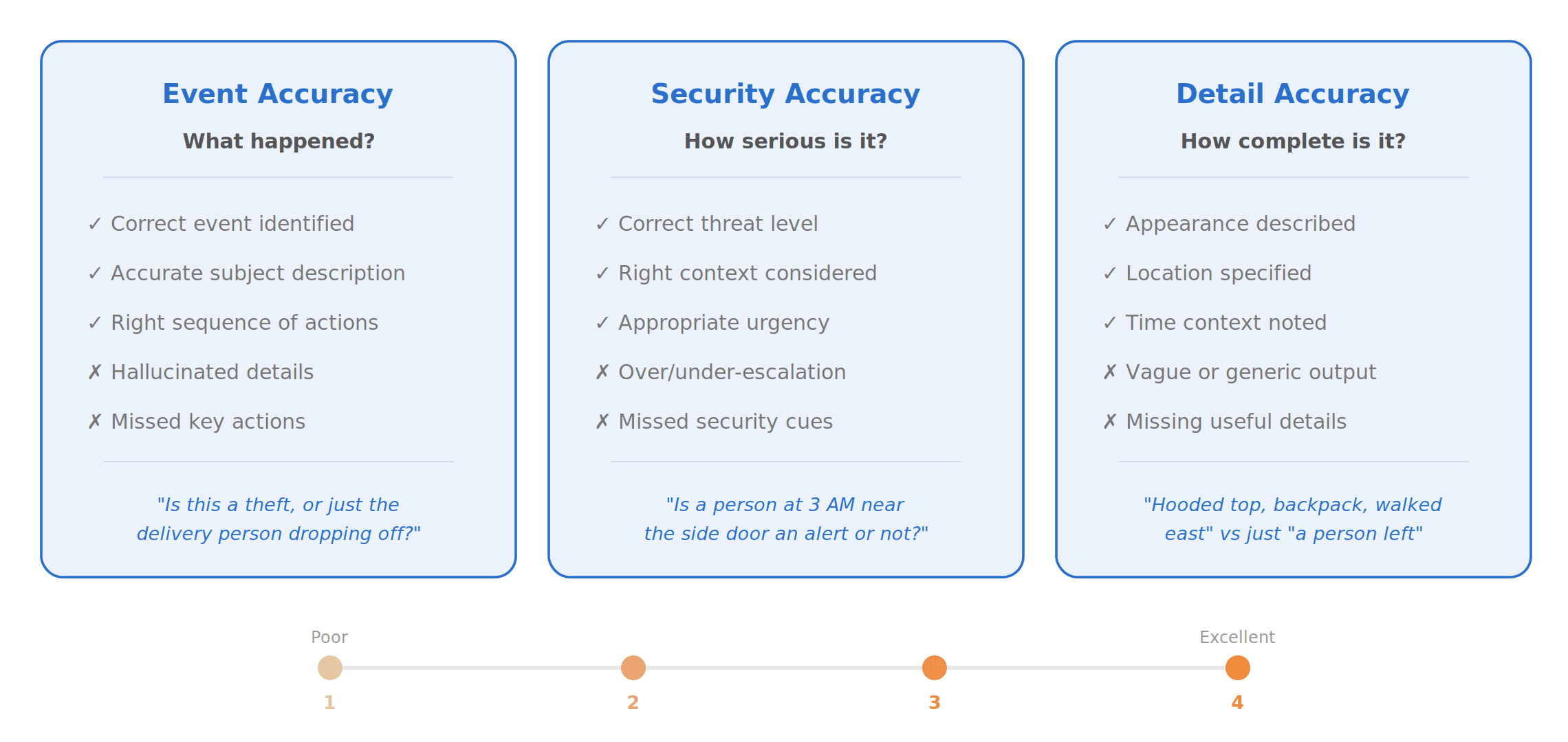 Existing smart home benchmarks like SmartHome-Bench from Wyze mostly evaluate models through question-answering tasks, which only captures part of the problem. For security, a model needs to both identify whether something is security-relevant and summarize what happened accurately and completely. We needed a benchmark that measures both security accuracy and summary fidelity.