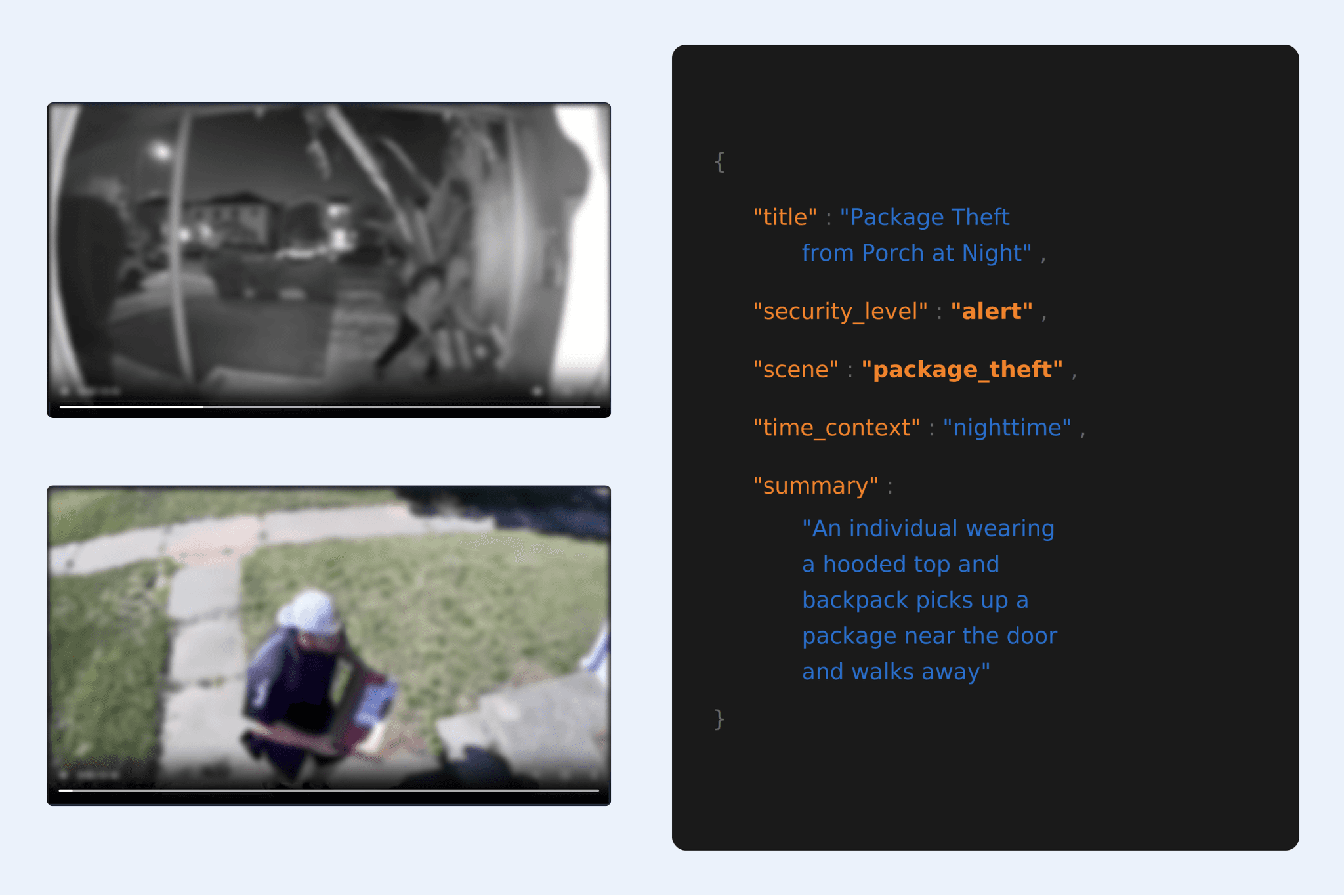 Alert categorization. Whether something should trigger an alert depends on more than the visible action. Time of day, location, prior activity, and scene context all matter. We trained the model to pick up on these environmental cues so it can make better judgments about severity. A person walking a dog past a home during the day may need no alert. The same person lingering near a side entrance at 3 AM is a very different event. Grounding classification in context lets the model make more accurate decisions about when to escalate and how serious the alert should be.