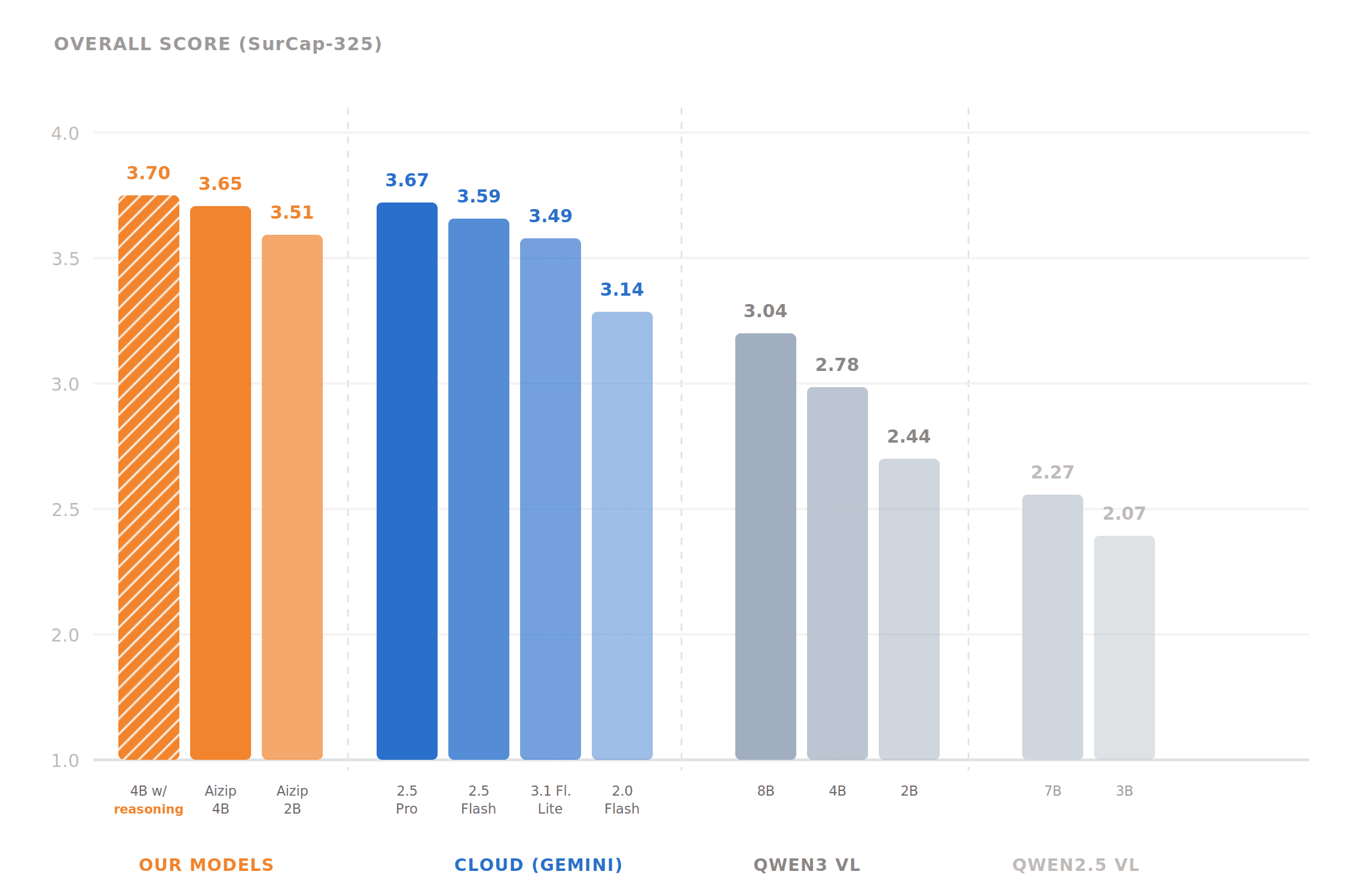 vs. cloud (Gemini). Gemini Flash is the model most teams would realistically deploy in production for cost and speed. Our best fine-tuned model (3.70 overall, 3.88 security accuracy) outperforms Gemini 2.5 Flash (3.59, 3.69) and matches Gemini 2.5 Pro (3.67, 3.77). Notably, Gemini 2.5 versions scored higher than newer Gemini 3 and 3.1 releases on our security tasks, suggesting recent architectural changes optimized for general reasoning at the cost of visual grounding precision.