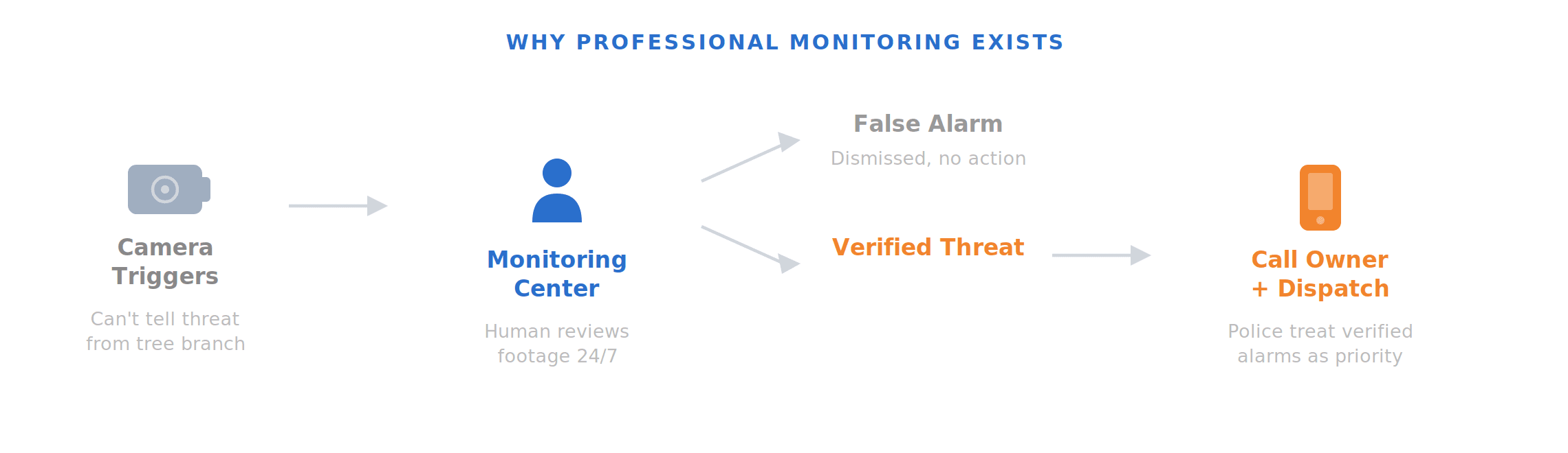 Professional monitoring services exist in part because providers know this happens. When an alarm triggers, a central station calls the homeowner. Some providers have humans review footage before dispatching authorities. That entire layer of labor exists because the camera can't tell the difference between a real threat and a tree branch.