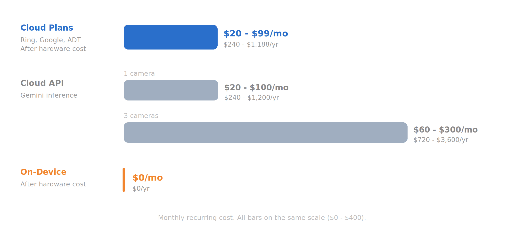 If you tried to build this yourself via API, the math is worse. Video input on Gemini consumes roughly 258 tokens per second. Even at a conservative sampling rate, Gemini Flash costs $20 to $30 per camera per month. Gemini Pro jumps to $80 to $100. Three cameras and you're at $100 to $400 per month just for inference.